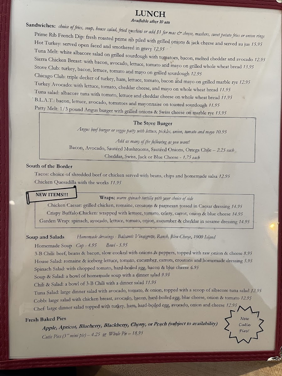 Lunch options shine with choices like the Prime Rib French Dip, featuring freshly roasted prime rib complemented by grilled onions and jack cheese, all served au jus for an extra touch of decadence. The Tuna Melt, made with white albacore salad piled high on grilled sourdough, is another crowd-pleaser, while the Sierra Chicken Breast sandwich offers a hearty mix of bacon, avocado, and fresh veggies—perfect for fueling your adventures in the mountains.